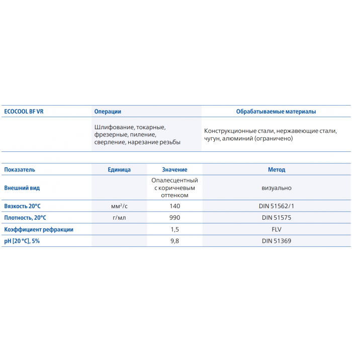 ECOCOOL BF VR - мелкодисперсная СОЖ для лезвийной обработки сталей и чугуна. Ecocool BF VR – это современная водосмешиваемая смазочно-охлаждающая жидкость без содержания бора и формальдегидов, предназначенная для обработки чугуна и конструкционных сталей. Ecocool BF VR при смешении с водой образует стабильную эмульсию с длительным сроком службы и стабильным значением pH.